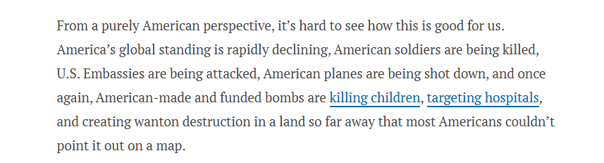 文章作者稱,(美國)這場“無緣無故且非法的軍事行為”已將地區(qū)拖入暴力升級的漩渦,導致數(shù)百名無辜平民喪生。即便從美國自身利益視角看,此舉亦難言獲益——美國全球地位正迅速下降,美軍士兵不斷傷亡,使館與飛機遭襲,而美國制造或資助的炸彈仍在遙遠土地上造成平民死傷與基礎設施破壞。