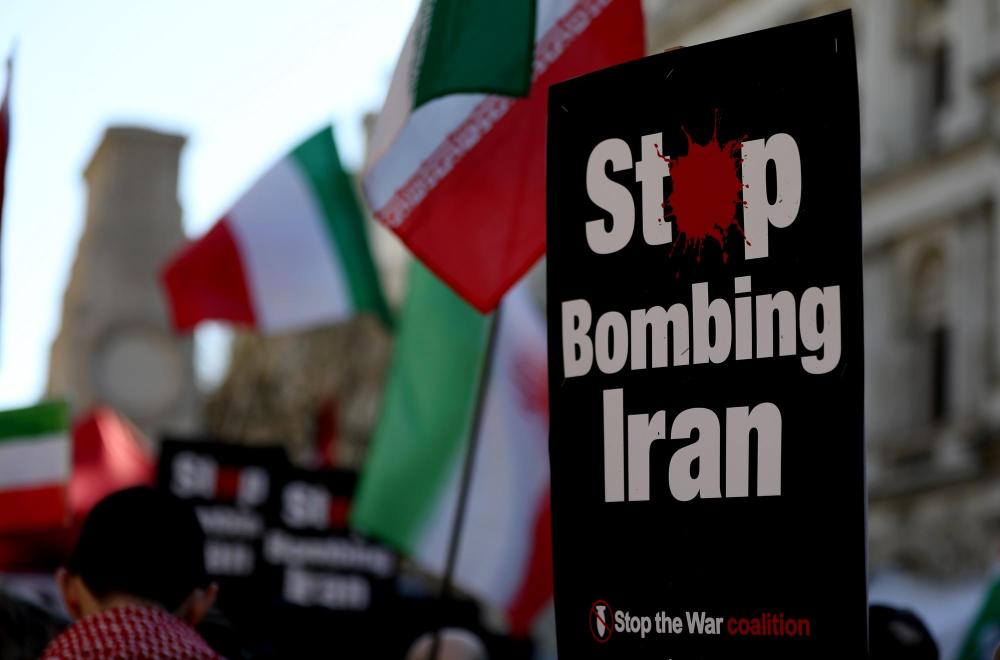 3月21日,人們?cè)谟?guó)倫敦參加集會(huì),抗議美國(guó)和以色列對(duì)伊朗發(fā)動(dòng)軍事打擊。新華社記者李穎攝