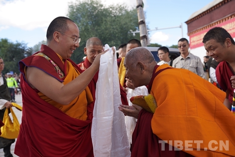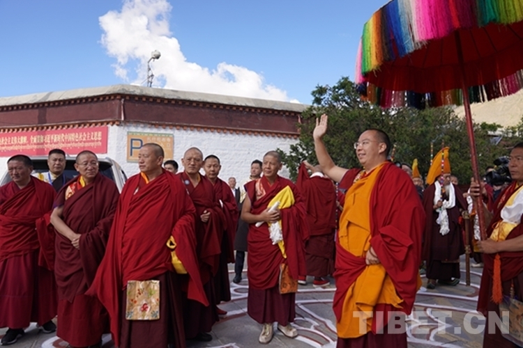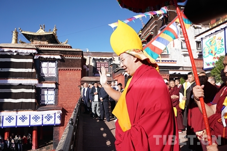 班禪一行順利抵達后,現(xiàn)場桑煙繚繞、法號長鳴,扎什倫布寺高僧代表向班禪敬獻哈達,班禪向僧眾及在此等候的信眾們揮手致意。隨后,班禪在手持黃傘、香爐的高僧引領(lǐng)下徐徐而行,經(jīng)多加大院進入措欽大殿。