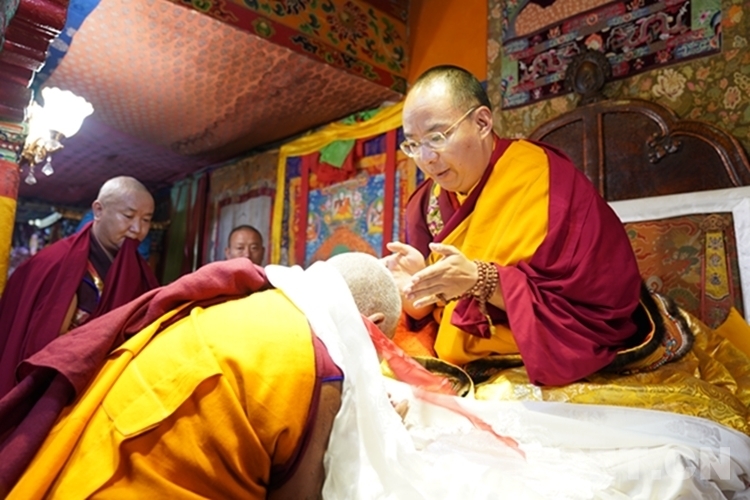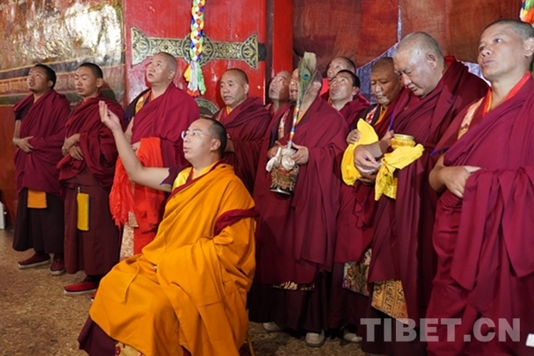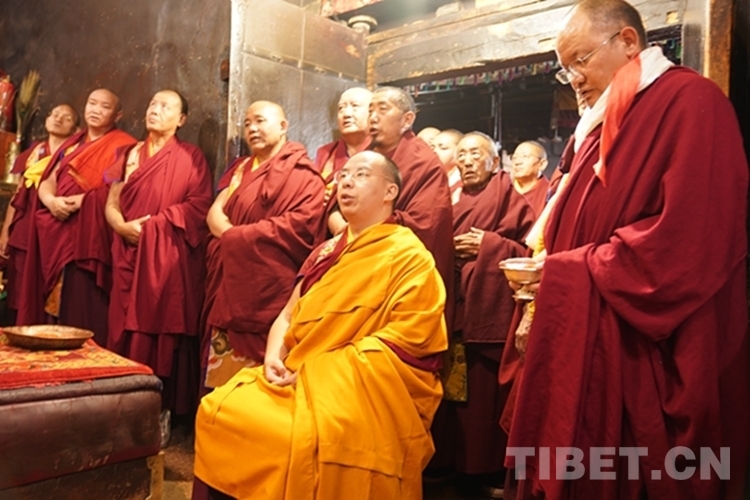當日下午,在扎什倫布寺拉讓日光殿,班禪登上法座,接受扎什倫布寺管委會僧人成員、高僧朝拜,為他們摸頂賜福,并帶領(lǐng)高僧誦經(jīng)祈福。