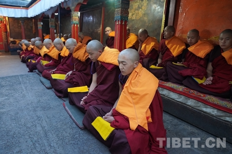 當(dāng)天清晨,扎什倫布寺桑煙繚繞、法號(hào)聲聲,28 位受戒的年輕僧人帶著新制袈裟,迎著朝霞依次走向拉讓殿等待班禪授戒這一神圣時(shí)刻的到來(lái)。8時(shí)許,在手持黃傘、香爐和吹嗩吶的高僧護(hù)送引領(lǐng)下班禪緩緩步入拉讓殿,并與在場(chǎng)僧眾集體誦經(jīng)。誦經(jīng)儀式結(jié)束后,班禪就坐于拉讓殿寶座,4名高僧大德作為授戒眾,開(kāi)始為僧人閉門(mén)授戒、剃度、賜法名、摸頂。此時(shí),受戒僧人一一入座,兩手在胸前交叉,聽(tīng)班禪引證經(jīng)典告誡,并宣誓嚴(yán)守戒律。