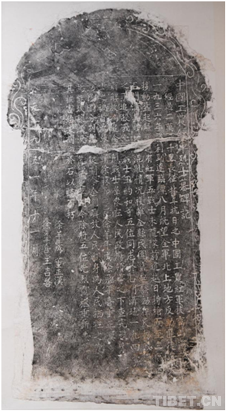 展覽中還有一幅與紅軍過雪域有關(guān)的展品——《中國工農(nóng)紅軍烈士墓碑》(1951年)拓片。碑文記錄了這樣一段歷史:1936年,中國工農(nóng)紅軍長征北上抗日到達(dá)臨潭(今甘肅省甘南藏族自治州臨潭縣)時,紅軍戰(zhàn)士王約如等5位戰(zhàn)士在石門溝犧牲。1949年,這5位戰(zhàn)士被追念為先烈戰(zhàn)士,人民政府查究兇手,重新安葬了英烈戰(zhàn)士靈柩。