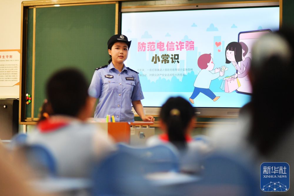9月15日,在山東省榮成市府新小學(xué)教室內(nèi),轄區(qū)民警通過案例講解為學(xué)生們普及網(wǎng)絡(luò)安全和防詐騙知識(shí)。新華社發(fā)(李信君攝)