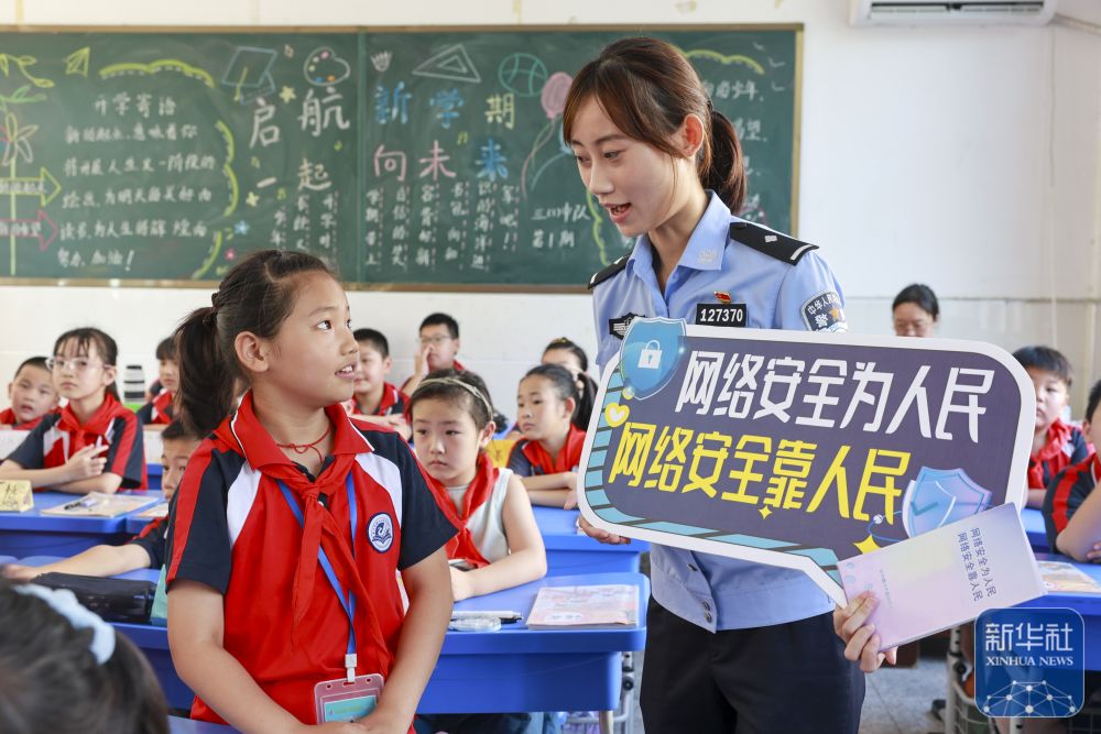 9月15日,在江蘇省泰興市襟江小學(xué)教育集團(tuán)佳源校區(qū),泰興市公安局城北派出所民警通過互動(dòng)方式在給學(xué)生講解網(wǎng)絡(luò)安全知識(shí)。新華社發(fā)(顧繼紅攝)