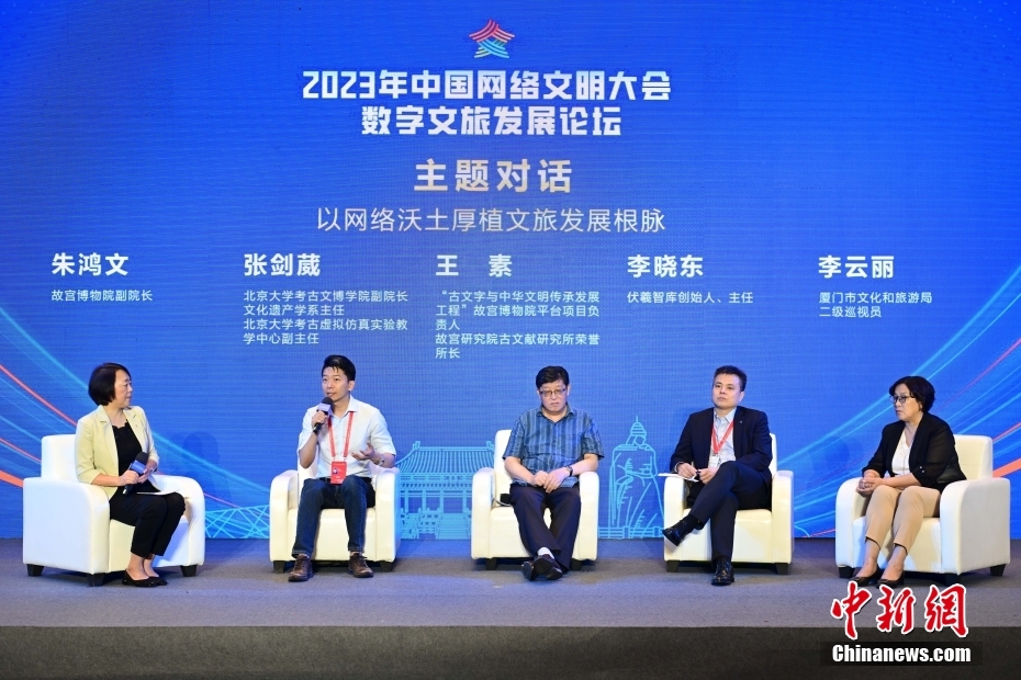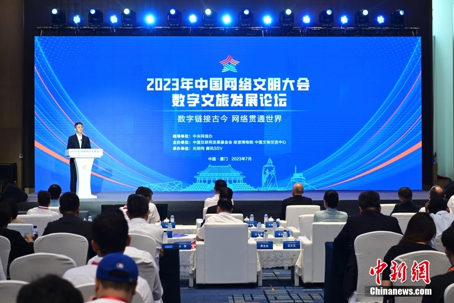 7月19日,2023年中國(guó)網(wǎng)絡(luò)文明大會(huì)數(shù)字文旅發(fā)展論壇在福建省廈門市舉辦。論壇以“數(shù)字鏈接古今 網(wǎng)絡(luò)貫通世界”為主題,邀請(qǐng)國(guó)內(nèi)外數(shù)字化、文博考古、旅游等領(lǐng)域?qū)<液痛砉餐剿鞴偶奈镌跀?shù)字時(shí)代的創(chuàng)造性轉(zhuǎn)化和創(chuàng)新性發(fā)展,以及在數(shù)字技術(shù)賦能下,文旅產(chǎn)業(yè)如何實(shí)現(xiàn)高質(zhì)量發(fā)展。圖為論壇現(xiàn)場(chǎng)。中新社記者 田雨昊 攝