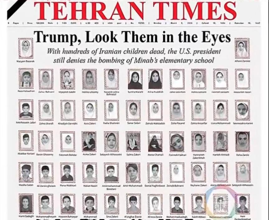伊朗《德黑蘭時(shí)報(bào)》3月9日在頭版刊發(fā)題為《特朗普,請(qǐng)注視他們的眼睛》的文章,此前美國(guó)空襲導(dǎo)致伊朗南部米納卜市一所小學(xué)至少165人遇難、96人受傷 圖片來(lái)源:新華社