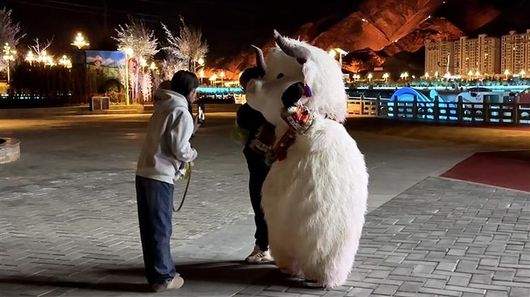 作為拉薩河夜游的核心亮點之一,“牦牛天團”一經(jīng)登陸濱河公園碼頭及游船沿線,便憑借圓潤造型與靈性互動圈粉無數(shù)。游客們紛紛與這些象征吉祥快樂的高原“萌獸使者”合影留念,小朋友們追著玩偶舞步歡笑奔跑,相關(guān)打卡視頻在社交平臺快速傳播,話題瀏覽量短時間內(nèi)突破千萬量級。夜幕下,牦牛玩偶的暖色調(diào)身影與游船舷燈、沿岸燈光秀交相輝映,構(gòu)成“船在水中走,人在畫中游,萌獸身邊繞”的獨特景致,讓45分鐘的夜游路線充滿驚喜。