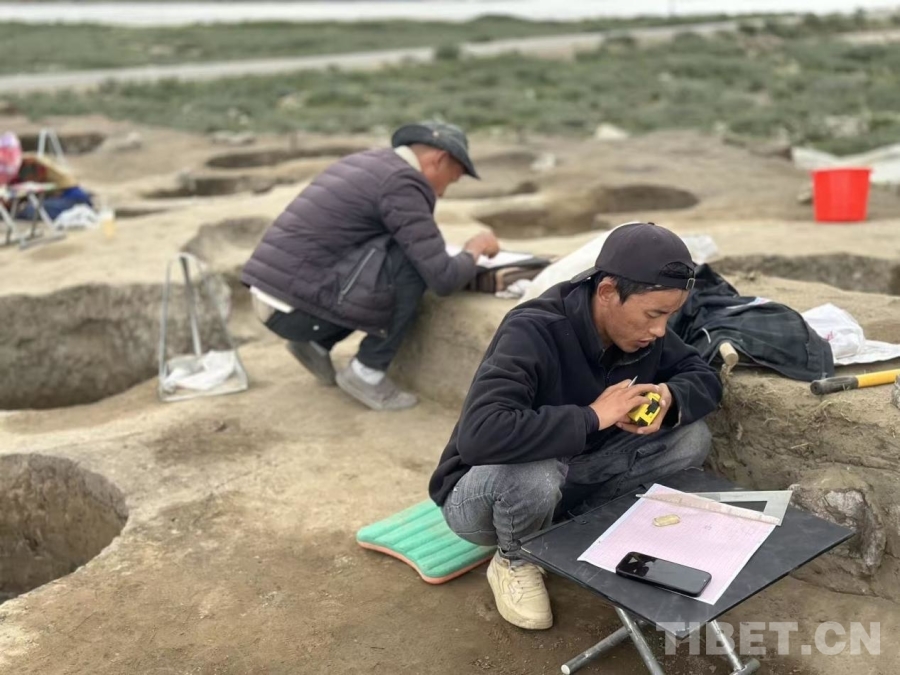圖為達(dá)瓦格桑和團(tuán)隊(duì)工作人員開展廓雄遺址田野考古發(fā)掘工作