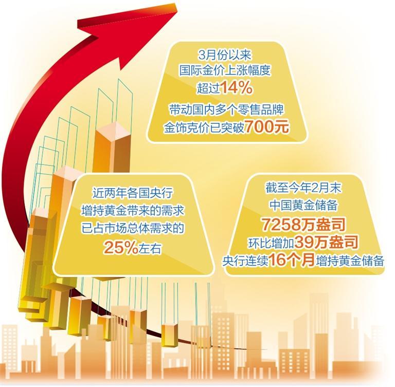 市場分析人士認為,今年以來,在美聯(lián)儲貨幣政策確定轉(zhuǎn)向的背景下,疊加近期地緣政治沖突激化,以及全球多國央行對黃金的持續(xù)需求,多因素共同推動了國際金價的強勁上漲。