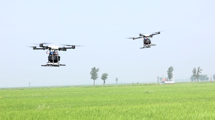 遙控?zé)o人機參與科學(xué)種植。公主嶺市委宣傳部供圖