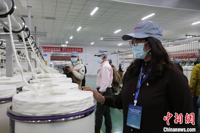 4月13日,外國媒體人來到新疆尉犁縣利華紡織有限公司紡紗廠參觀。 徐雪瑩 攝