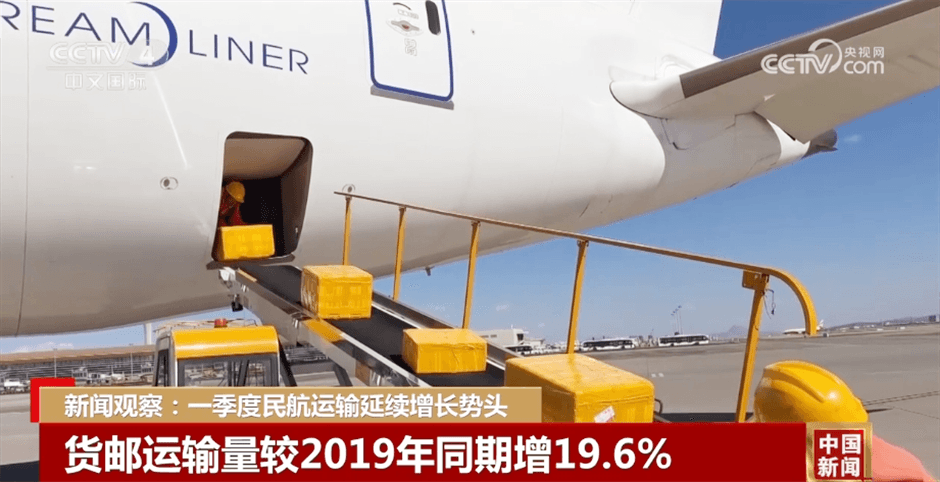 貨運(yùn)方面,全行業(yè)一季度共完成貨郵運(yùn)輸量200.7萬噸,為歷年一季度貨運(yùn)量最高值,同比增長34.4%,較2019年同期增長19.6%。其中,國內(nèi)航線較2019年同期增長8.2%,國際航線較2019年同期增長43.6%。