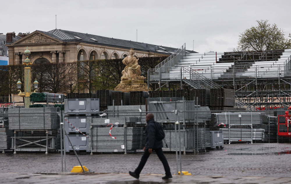 4月2日,行人經(jīng)過法國巴黎協(xié)和廣場的奧運比賽場地和看臺建設(shè)工地。新華社記者 高靜 攝