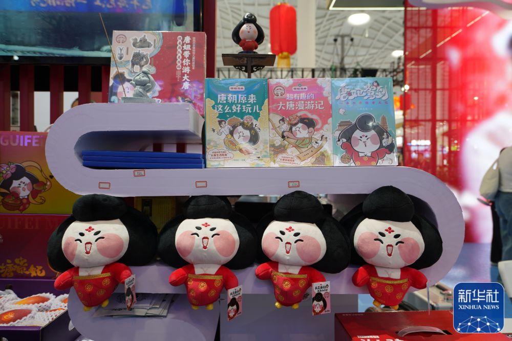 國貨特色潮品展區(qū)陜西展臺展示了“唐妞”系列文創(chuàng)產(chǎn)品。“唐妞”的卡通形象取材于陜西歷史博物館館藏文物——唐代彩繪仕女俑。新華社記者楊冠宇 攝