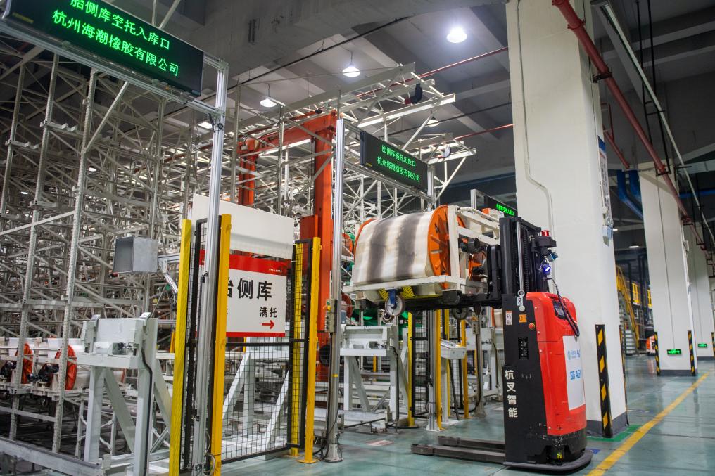 在杭州市錢塘區(qū)中策橡膠集團(tuán)股份有限公司未來工廠內(nèi),無人叉車在運(yùn)輸產(chǎn)品(2024年2月23日攝)。新華社記者 江漢 攝