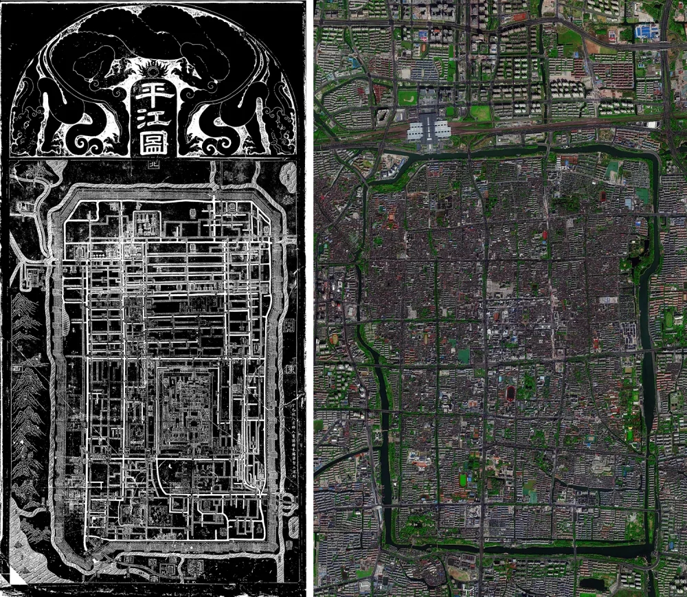 拼版照片:左圖為宋代碑刻《平江圖》(資料照片);右圖為2023年3月拍攝的蘇州古城的衛(wèi)星圖像。新華社發(fā)