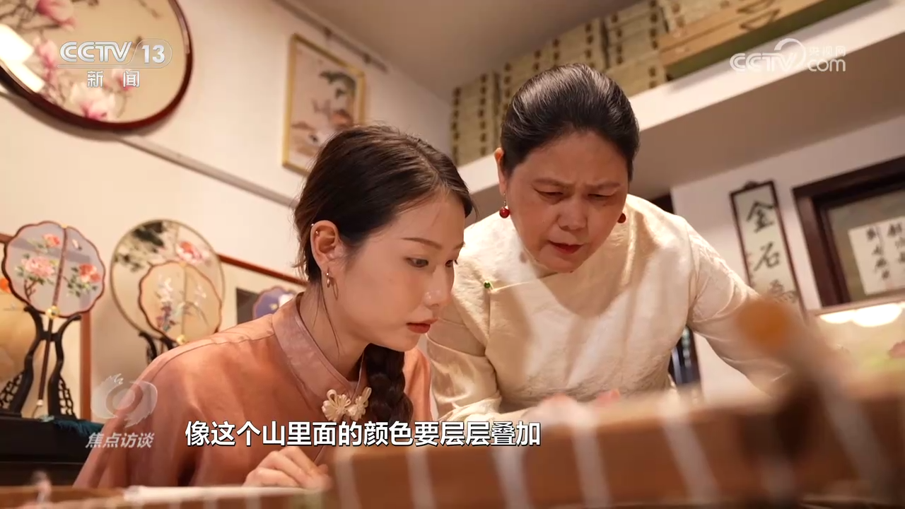 盧建英是蘇州當(dāng)?shù)赜忻奶K繡代表性傳承人。記者見到她的時(shí)候,她正在指導(dǎo)女兒刺繡。