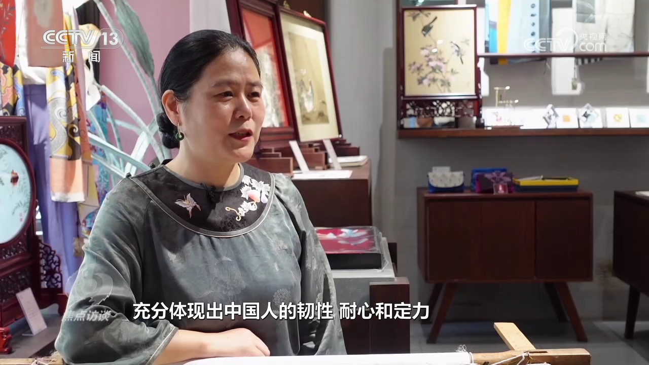 盧建英:“當(dāng)時(shí)我在繡一幅《桃花太平鳥圖》,習(xí)近平總書記走到了我的繃架前。他說你好,很親切,很和藹,看得非常仔細(xì)。他說中華文化的傳承力有多強(qiáng),通過這個(gè)蘇繡可以看出來,像這樣的功夫充分體現(xiàn)出中國人的韌性、耐心和定力,這是中華民族精神的一部分,能得到總書記的認(rèn)可,真的是倍感榮耀?!?/p>