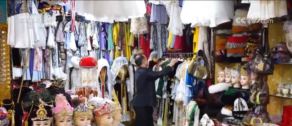 在總臺(tái)2024年春晚舞臺(tái)上,演員們身穿特色服飾進(jìn)行表演,驚艷全場(chǎng)。春晚過后,慕名前來購(gòu)買和定制艾特萊斯服飾的游客不斷增加。努爾·買買提原本在當(dāng)?shù)亟?jīng)營(yíng)一家數(shù)碼產(chǎn)品店鋪,看到旅拍店艾特萊斯服飾等傳統(tǒng)民族服裝的租賃和定制需求增加,他便在喀什古城開了一家民族服裝綜合店。