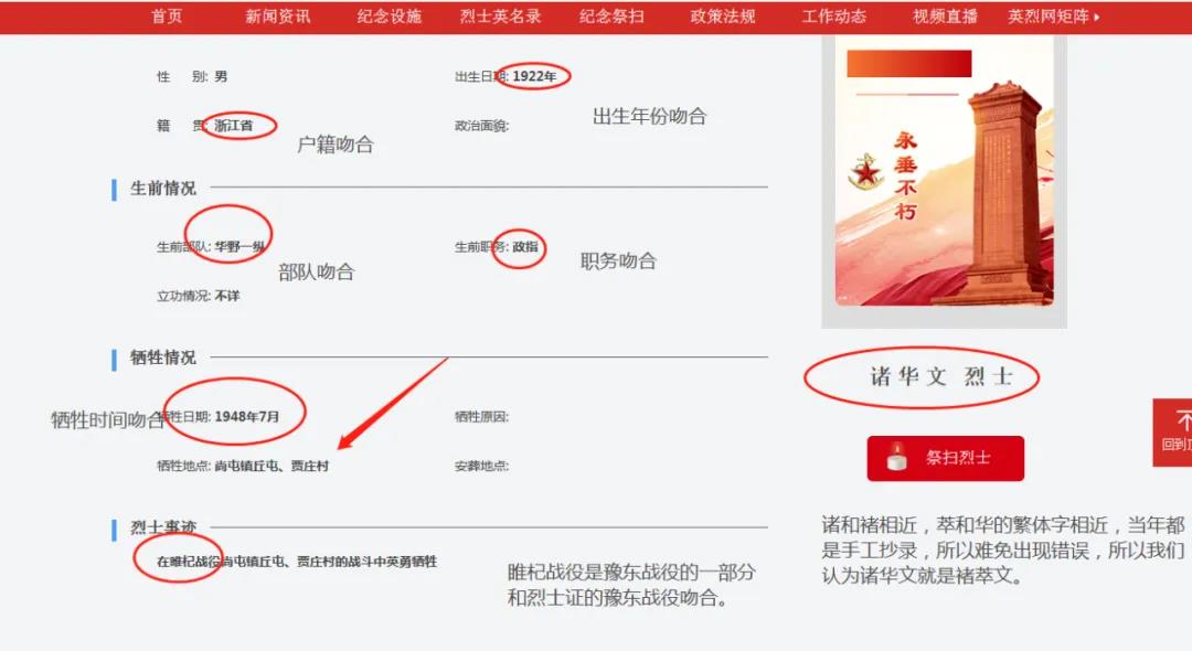 基本信息中,諸華文的出生年份、戶籍、生前情況和犧牲情況都與褚萃文吻合;姓名方面,“諸”與“褚”偏旁相似,而華的繁體寫法(華)與萃也有些相似,可能是登記時出現(xiàn)了錯誤。