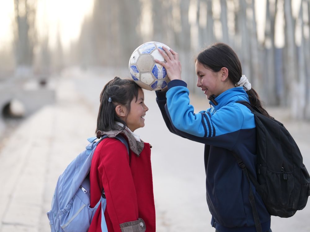 “我的紙飛機(jī)呀飛呀飛,飛到了蘆蕩邊。帶我去看落日晚霞,還有開(kāi)滿花的田野……”姐妹倆給水指導(dǎo)唱了她們學(xué)過(guò)的歌。水指導(dǎo)給她們送了嶄新的足球,勉勵(lì)她們要好好踢球,也要好好學(xué)習(xí)。