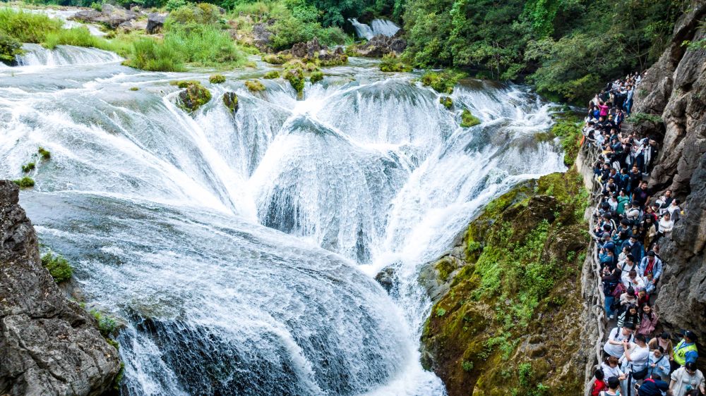 5月2日,游客在貴州省安順市天星橋景區(qū)游覽銀鏈墜潭瀑布(無(wú)人機(jī)照片)。 新華社發(fā)(陳熙 攝)