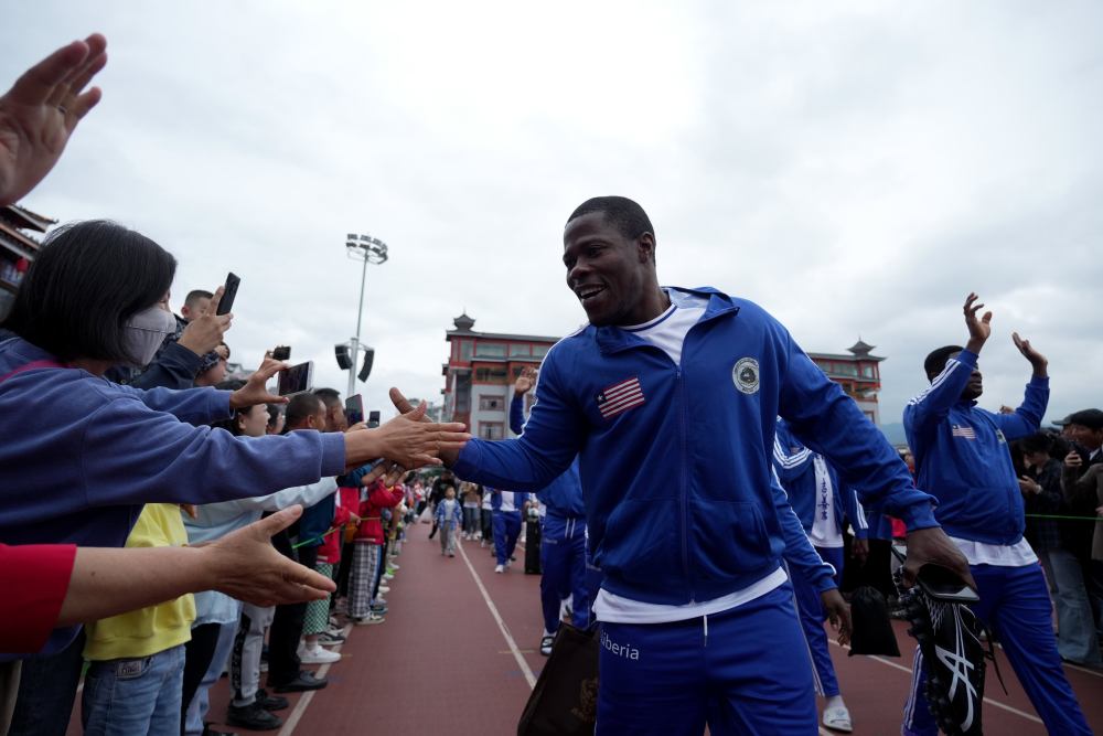 5月1日,貴州省黔東南苗族侗族自治州榕江縣“村超”球場(chǎng),來(lái)自非洲利比里亞社聯(lián)足球隊(duì)球員與群眾互動(dòng)。新華社發(fā)(王炳真 攝)