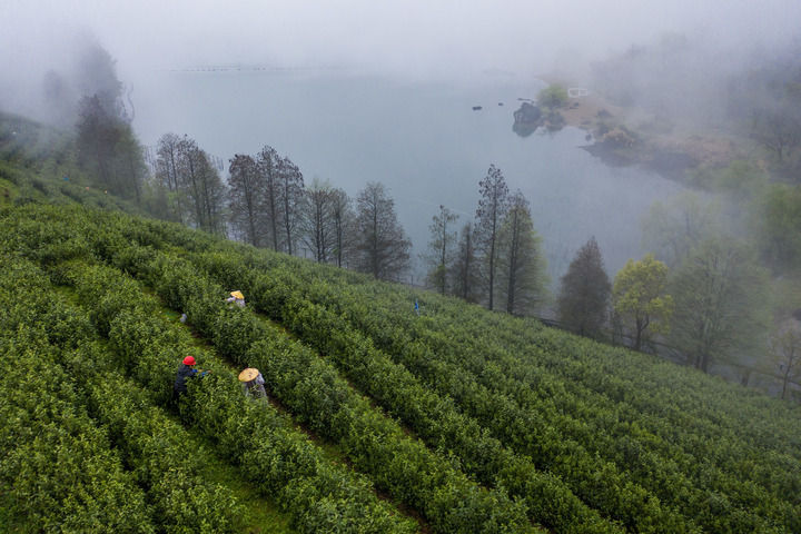 2024年4月7日,在位于浙江省金華市金華山鹿田村的婺州舉巖茶基地,茶農在采摘舉巖茶鮮葉,發(fā)展特色茶產業(yè)是推動當?shù)匕傩展哺坏闹匾緩街唬o人機照片)。新華社記者 徐昱 攝