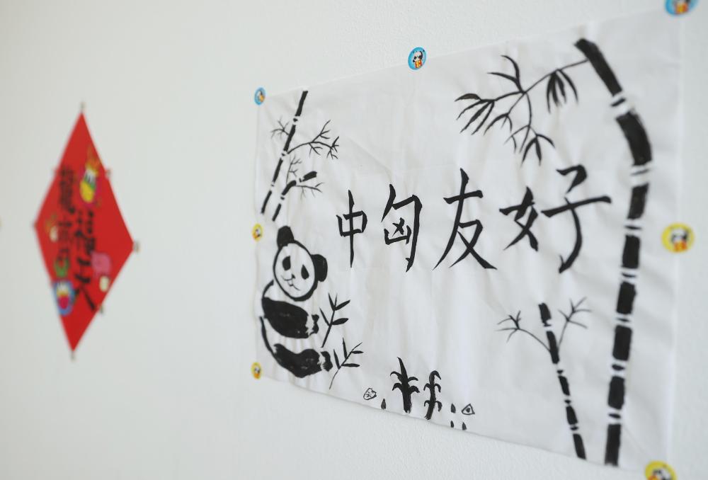 寫(xiě)有“中匈友好”的小朋友畫(huà)作貼在匈中雙語(yǔ)學(xué)校教室墻上(2024年5月3日攝)。