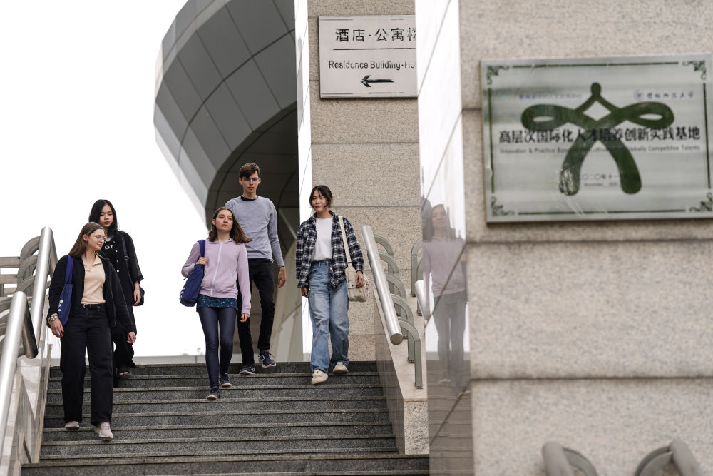 宋智孝(左二)在北京首都師范大學(xué)校園內(nèi)與同學(xué)交流(2024年4月28日攝)。