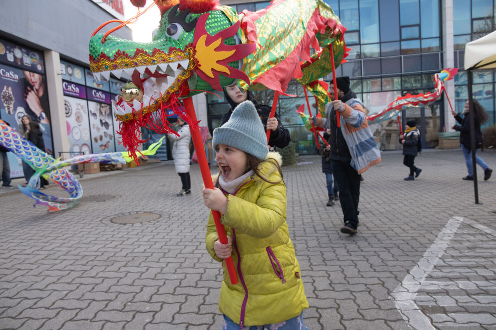 2024年2月3日,一名女孩在匈牙利布達(dá)佩斯唐人街的新春廟會(huì)上體驗(yàn)舞龍。