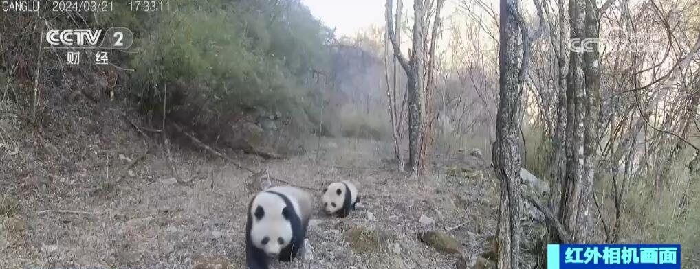 這段視頻拍攝于海拔約2000米處,大熊貓媽媽身形健壯,步伐從容地走在前面,幼崽嬌小可愛,緊緊跟在媽媽的身后。十幾分鐘后,這對(duì)“母子”的身影再次出現(xiàn)在同一條溝的另一個(gè)點(diǎn)位。