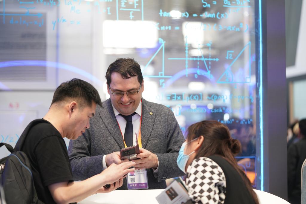 5月18日,在第八屆中俄博覽會(huì)展館內(nèi),參會(huì)者在進(jìn)行商務(wù)交流。新華社記者 王松 攝