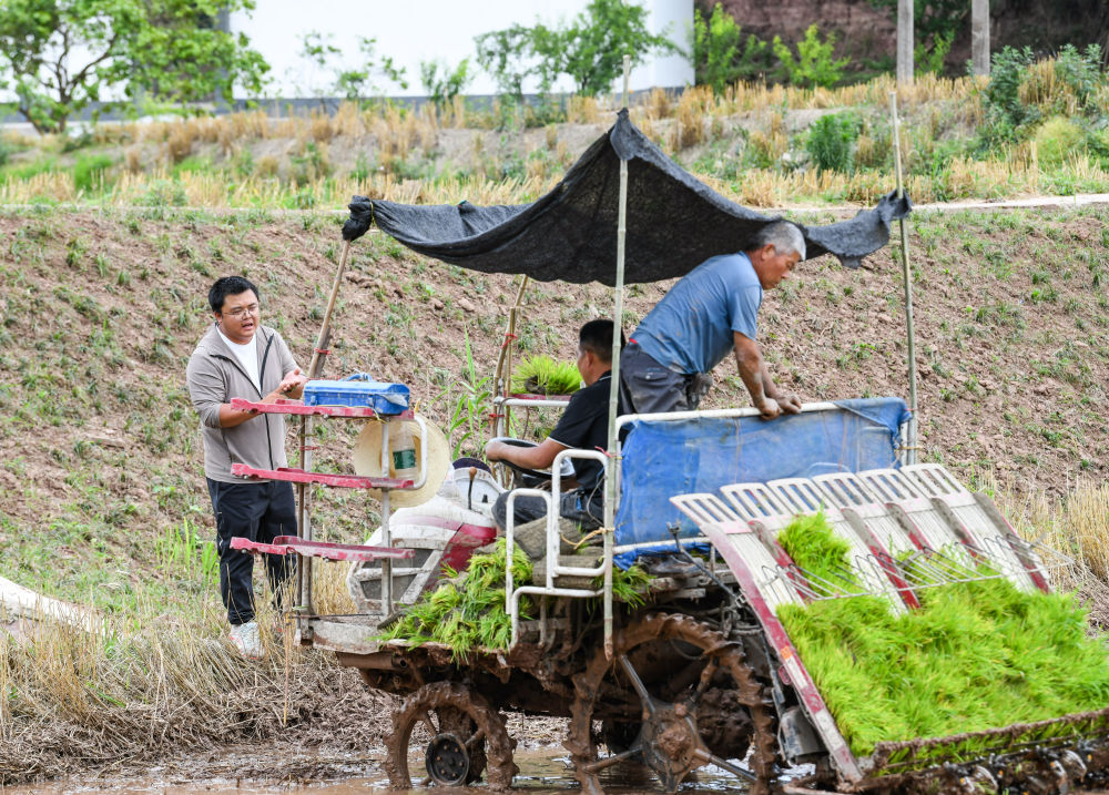 在四川成都東部新區(qū)董家埂鎮(zhèn)小河村,舒星宇(左)在和插秧機(jī)手溝通機(jī)插秧的注意事項(xiàng)(5月15日攝)。