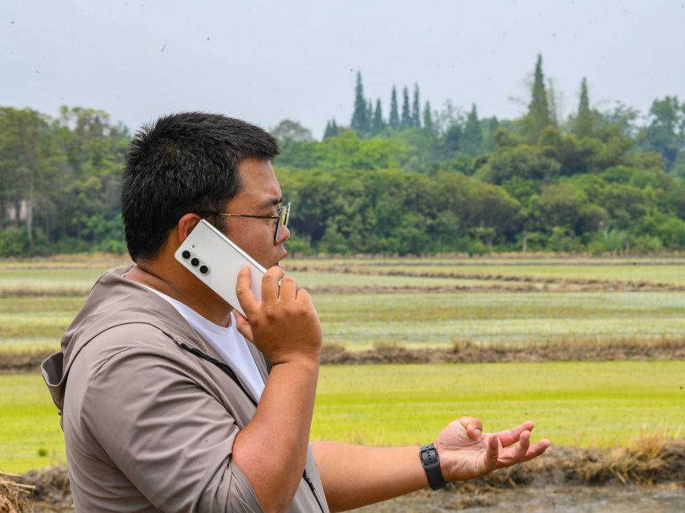 在四川成都崇州市大劃街道石橋村,舒星宇接到種植大戶的電話,溝通農(nóng)機(jī)服務(wù)需求(5月15日攝)。