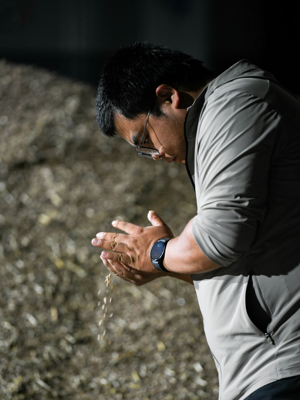 在四川成都崇州市萬(wàn)茂欣欣農(nóng)機(jī)專業(yè)合作社,舒星宇在查看庫(kù)房待烘干小麥的情況(5月15日攝)。