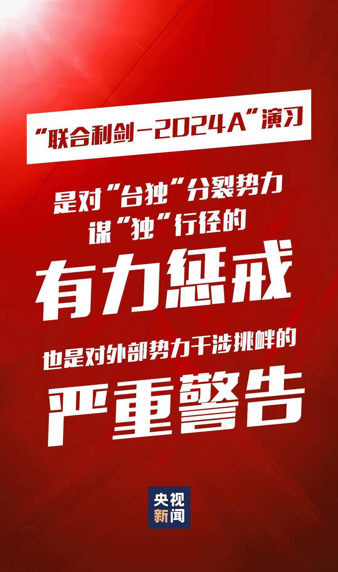 5月23日至24日,中國(guó)人民解放軍東部戰(zhàn)區(qū)組織戰(zhàn)區(qū)陸軍、海軍、空軍、火箭軍等兵力,位臺(tái)島周邊開展“聯(lián)合利劍-2024A”演習(xí),重點(diǎn)演練聯(lián)合海空戰(zhàn)備警巡、聯(lián)合奪取戰(zhàn)場(chǎng)綜合控制權(quán)、聯(lián)合精打要害目標(biāo)等科目,艦機(jī)抵近臺(tái)島周邊戰(zhàn)巡,島鏈內(nèi)外一體聯(lián)動(dòng),檢驗(yàn)戰(zhàn)區(qū)部隊(duì)聯(lián)合作戰(zhàn)實(shí)戰(zhàn)能力。這是中國(guó)維護(hù)國(guó)家主權(quán)和領(lǐng)土完整的正義之舉,也是對(duì)“臺(tái)獨(dú)”分裂勢(shì)力謀“獨(dú)”行徑的有力懲戒,對(duì)外部勢(shì)力干涉挑釁的嚴(yán)重警告。