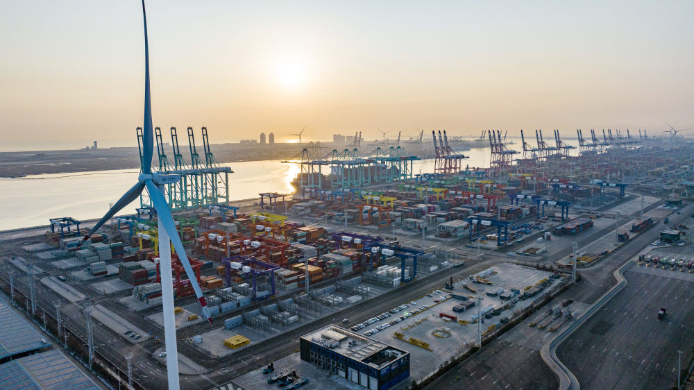 看似平常的碼頭作業(yè),背后卻另有玄機(jī)——整個(gè)過程達(dá)到了“零碳”排放。2021年底,隨著兩臺風(fēng)機(jī)葉片緩緩啟動(dòng),這座全球首個(gè)“智慧零碳”碼頭的智慧綠色能源系統(tǒng)開始并網(wǎng)發(fā)電,通過風(fēng)電、光伏發(fā)出的綠色能源,源源不斷為碼頭生產(chǎn)提供能源。