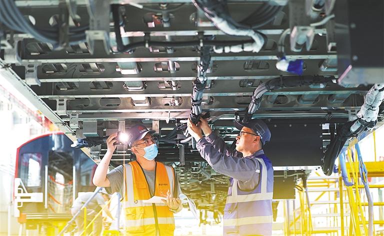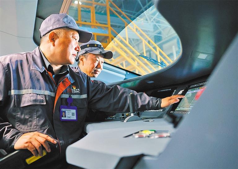 ?5月28日,中車長(zhǎng)客首席操作師羅昭強(qiáng)(前一)在對(duì)新一批復(fù)興號(hào)智能動(dòng)車組進(jìn)行出廠前的質(zhì)量檢查。
