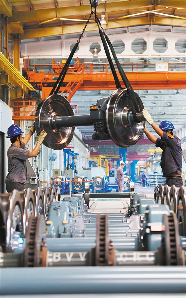 ▼5月28日,中車長(zhǎng)客轉(zhuǎn)向架事業(yè)部總成產(chǎn)線組,員工在進(jìn)行城軌輪對(duì)壓裝作業(yè)。
