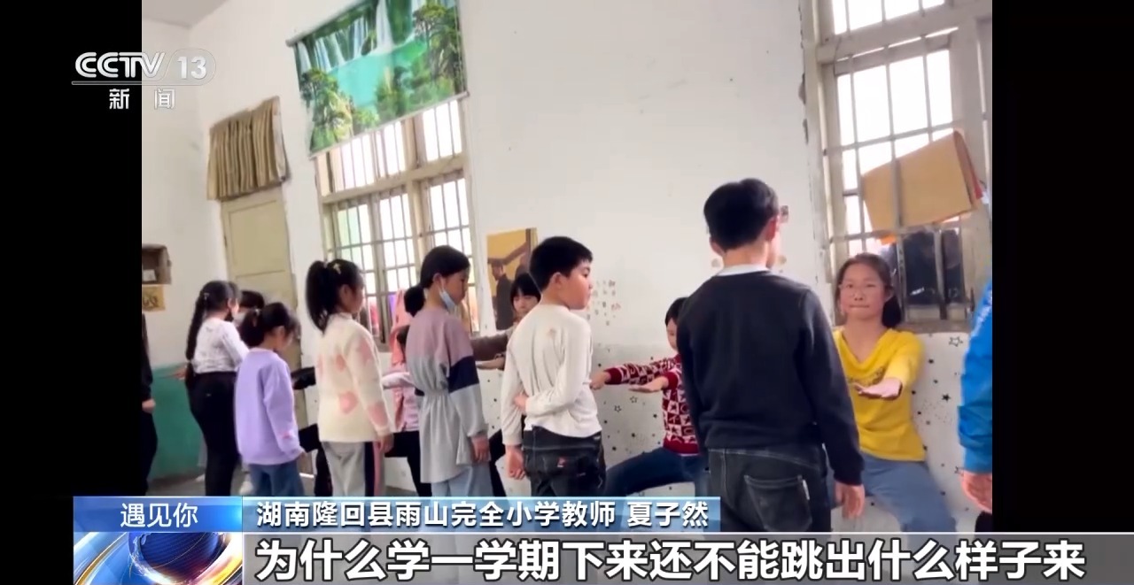 湖南隆回縣雨山完全小學老師 夏子然:跟他們跳舞,任何時候都是很難忘的回憶,每天都是限定版,我會用拍視頻的方式給記錄下來,在課后一個一個放大,去觀察他們的狀態(tài)和跳舞的動作,在第二節(jié)課,再做出相對應的調整。跳舞能夠讓他們放松,跳舞能夠讓他們變得開心,我最初的目的就達到了。