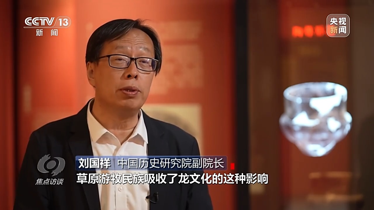 中國歷史研究院副院長 劉國祥:展覽之中,我們發(fā)現(xiàn)了一件匈奴的王冠,上面是一只鳥,下面一圈有虎、馬、龍,而且龍是草原龍的形象,草原游牧民族吸收了龍文化的影響。