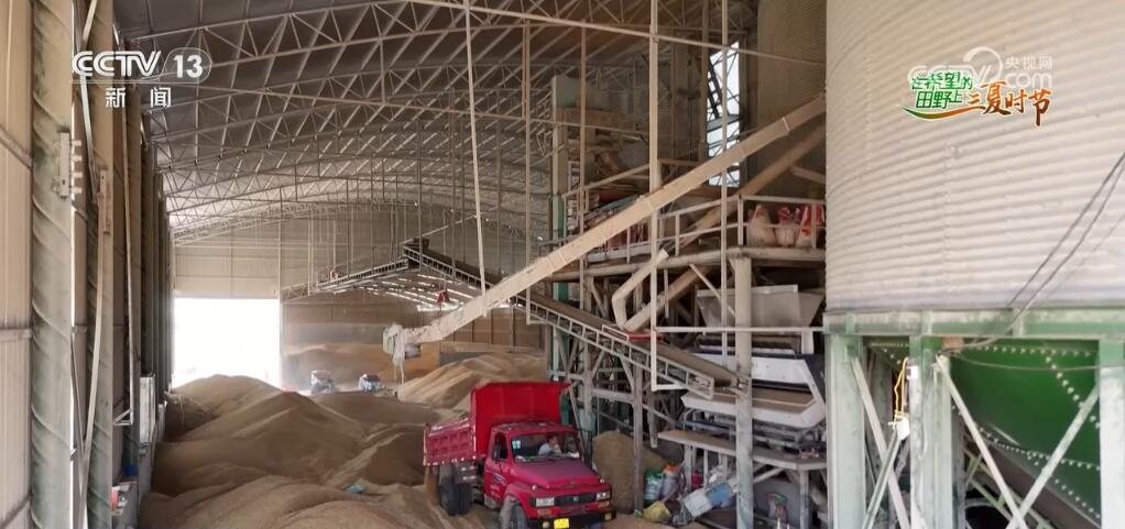 在河南南陽,麥?zhǔn)展ぷ饕鸦窘Y(jié)束。這是南陽鄧州市羅莊鎮(zhèn)的一家糧食收購點,種植戶們把剛剛收割完的小麥直接從田里拉來售賣。水分較低的糧食會直接收到倉庫中,水分較高的糧食則卸在晾曬場中,由烘干設(shè)備進行烘干。