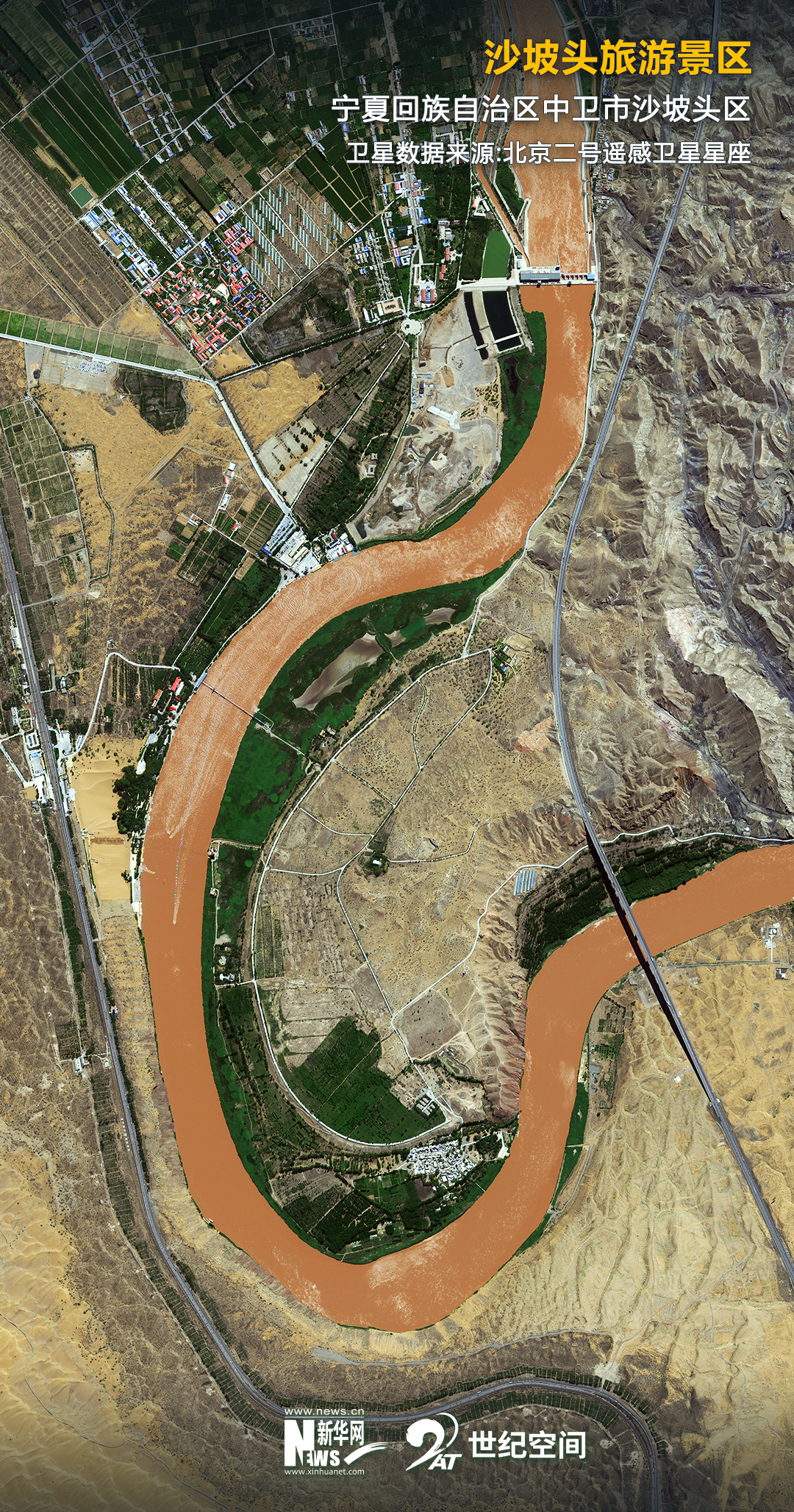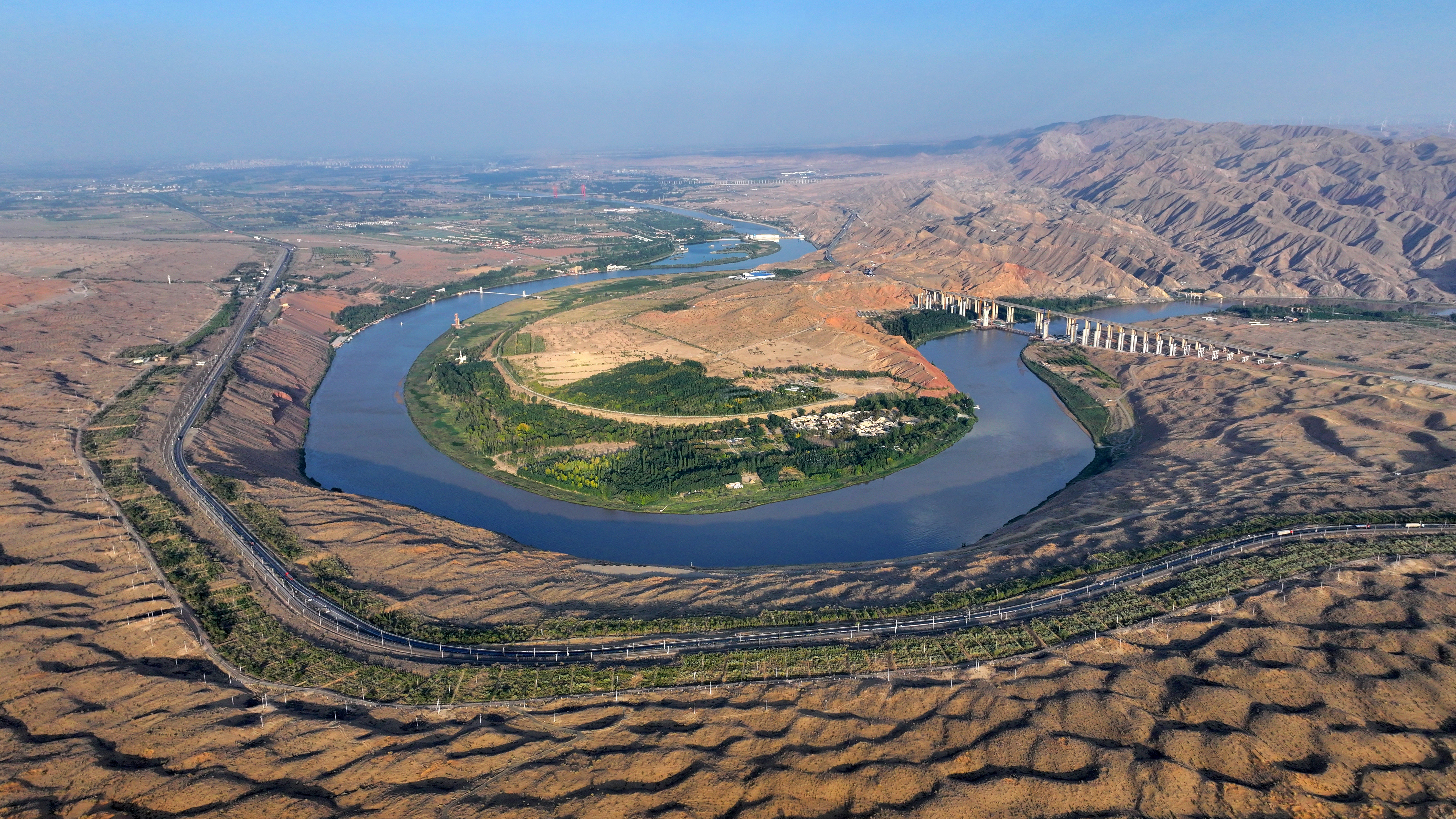 如今,在當?shù)赜嘘P部門開展的水系疏浚工程影響下,這里成為沙漠濕地的聚集地。黃河流經(jīng)此地,畫出了一道蜿蜒的曲線。河的一頭是騰格里沙漠的無垠瀚海,另一頭被一抹蒼翠鑲嵌在河岸邊。
