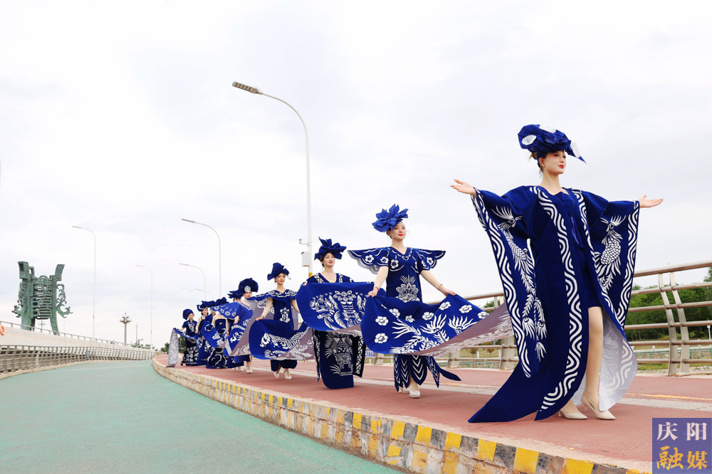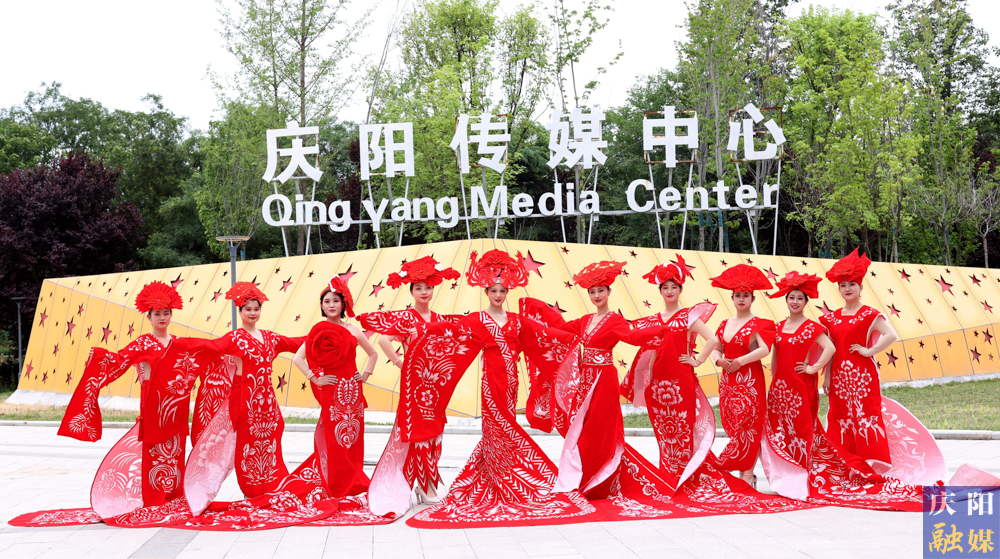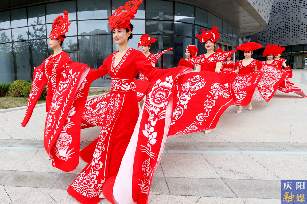 主播們身著刻鏤龍紋、鳳紋、抓髻娃娃、生命樹、魚鉆蓮、牡丹等剪紙紋樣,大V領(lǐng)、魚尾裙、聳肩收腰的“剪云裳”剪紙服裝,行走在傳媒大廈、西峰區(qū)彩虹橋、慶陽市城市海綿運動綠地等處,全方位、多角度地展示了剪紙服裝的特色與魅力。
