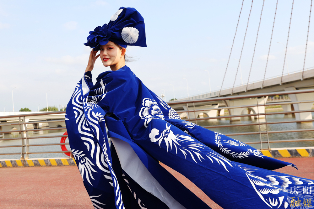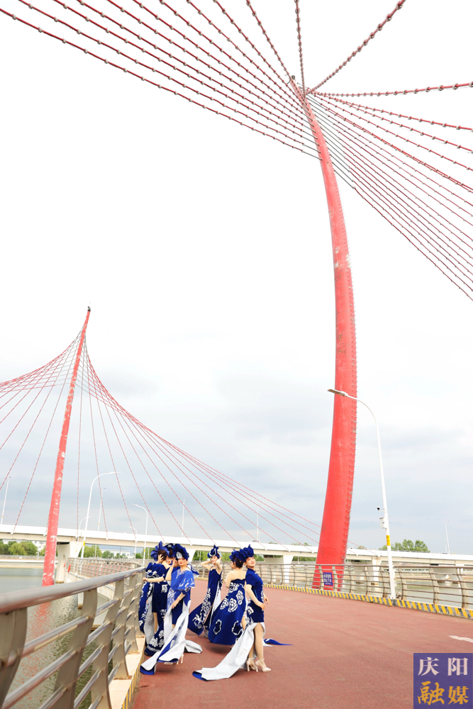 主播們在彩虹橋走秀,展示青花瓷系列服裝魅力。