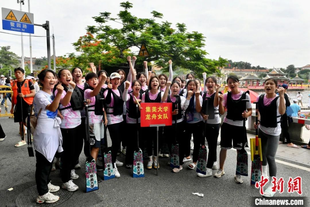 海峽兩岸龍舟賽在廈門集美上演。圖為集美大學(xué)龍舟女隊(duì)參加比賽。中新社記者 呂明 攝