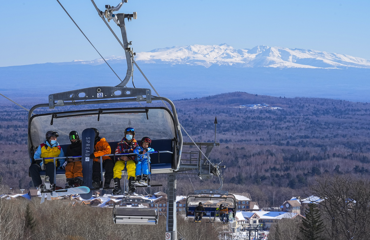 長(zhǎng)白山西坡的萬(wàn)達(dá)滑雪度假區(qū)內(nèi),雪友乘坐纜車上山。 記者 許暢 攝