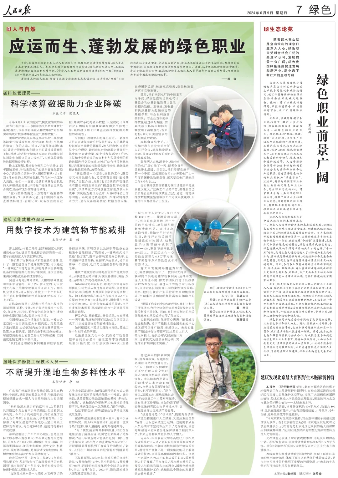 蓬勃發(fā)展的綠色職業(yè),契合了我國(guó)全面推進(jìn)生態(tài)文明建設(shè)、奮力實(shí)現(xiàn)“雙碳”目標(biāo)的經(jīng)濟(jì)社會(huì)發(fā)展需要,也是我國(guó)新產(chǎn)業(yè)、新業(yè)態(tài)不斷發(fā)展壯大的生動(dòng)寫照,對(duì)推動(dòng)美麗中國(guó)建設(shè)、實(shí)現(xiàn)經(jīng)濟(jì)社會(huì)高質(zhì)量發(fā)展有重要意義。近日,人民日?qǐng)?bào)記者實(shí)地探訪碳排放管理員、建筑節(jié)能減排咨詢師、濕地保護(hù)修復(fù)工程技術(shù)人員等綠色職業(yè)的工作場(chǎng)景,傾聽他們?yōu)槊利愔袊?guó)減碳增綠的故事。