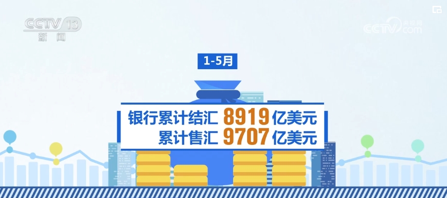 國家外匯管理局最新數(shù)據(jù)顯示,5月,銀行結(jié)匯1760億美元、售匯1919億美元;1—5月,銀行累計(jì)結(jié)匯8919億美元、累計(jì)售匯9707億美元。